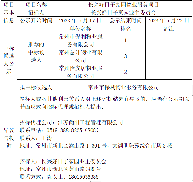 長興好日子家園物業(yè)服務(wù)項目中標(biāo)候選人公示