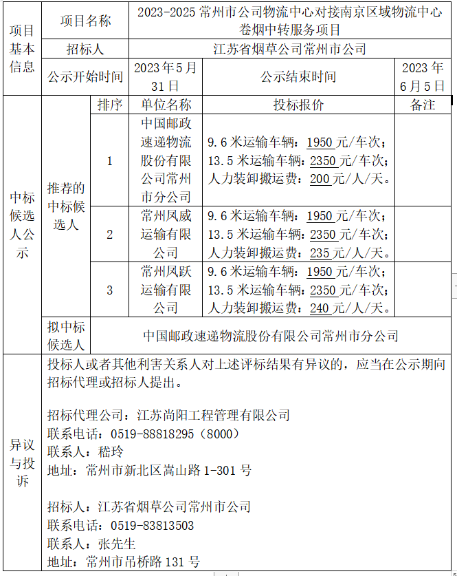 2023-2025常州市公司物流中心對(duì)接南京區(qū)域物流中心卷煙中轉(zhuǎn)服務(wù)項(xiàng)目中標(biāo)候選人公示
