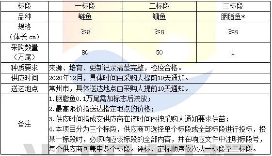 采購(gòu)需求:本項(xiàng)目是2020下半年長(zhǎng)江增殖放流苗種項(xiàng)目,在長(zhǎng)江常州段水域開展?jié)O業(yè)資源增殖流放工作,在長(zhǎng)江常州段放流體長(zhǎng)8cm以上的鰱魚、鳙魚以及胭脂魚魚種,由于采購(gòu)數(shù)量及苗種品種不同,因此本項(xiàng)目分為三個(gè)標(biāo)段,采購(gòu)清單如下: