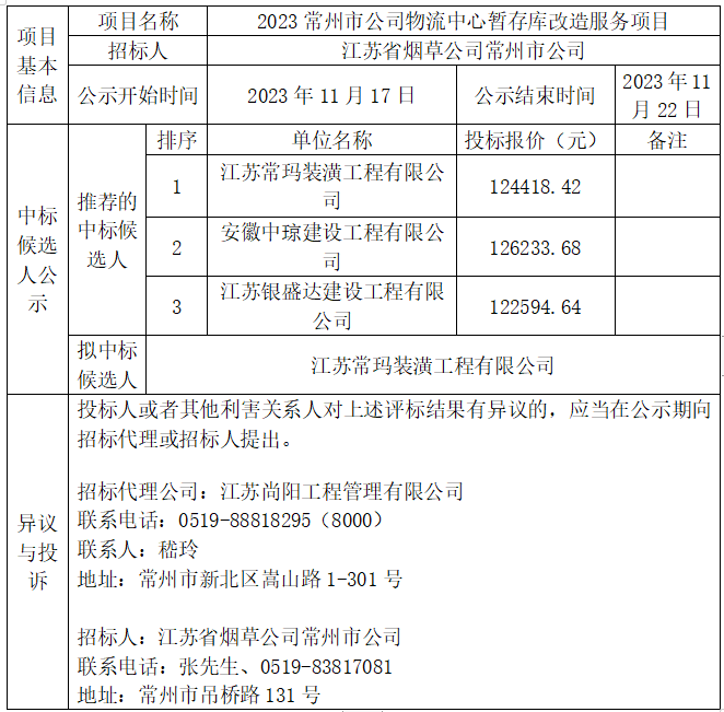 2023常州市公司物流中心暫存庫改造服務(wù)項目中標(biāo)候選人公示