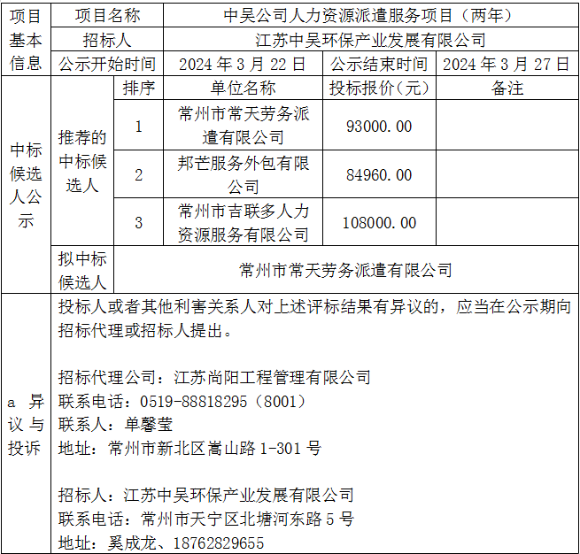 中吳公司人力資源派遣服務(wù)項(xiàng)目(兩年) 中標(biāo)候選人公示