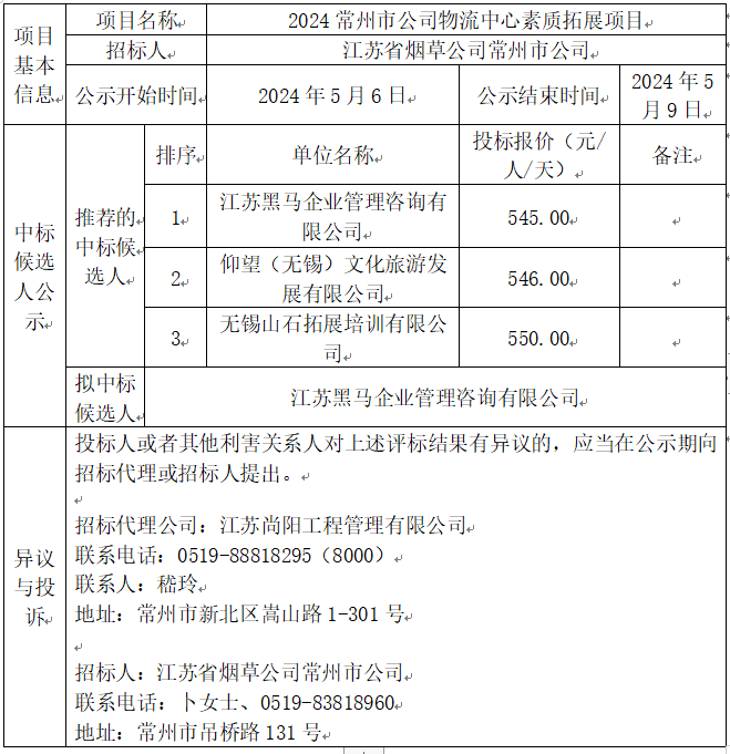 2024常州市公司物流中心素質(zhì)拓展項(xiàng)目 中標(biāo)候選人公示