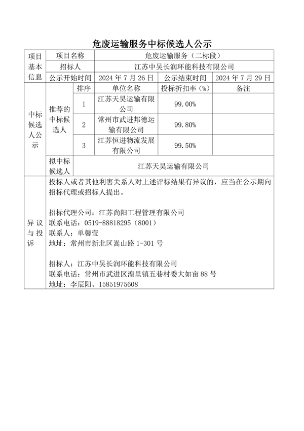 危廢運(yùn)輸服務(wù)中標(biāo)候選人公示