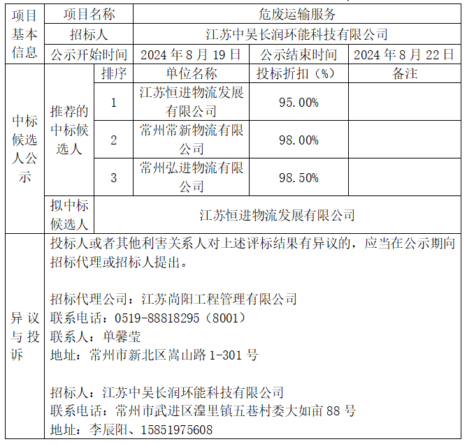 危廢運(yùn)輸服務(wù)中標(biāo)候選人公示
