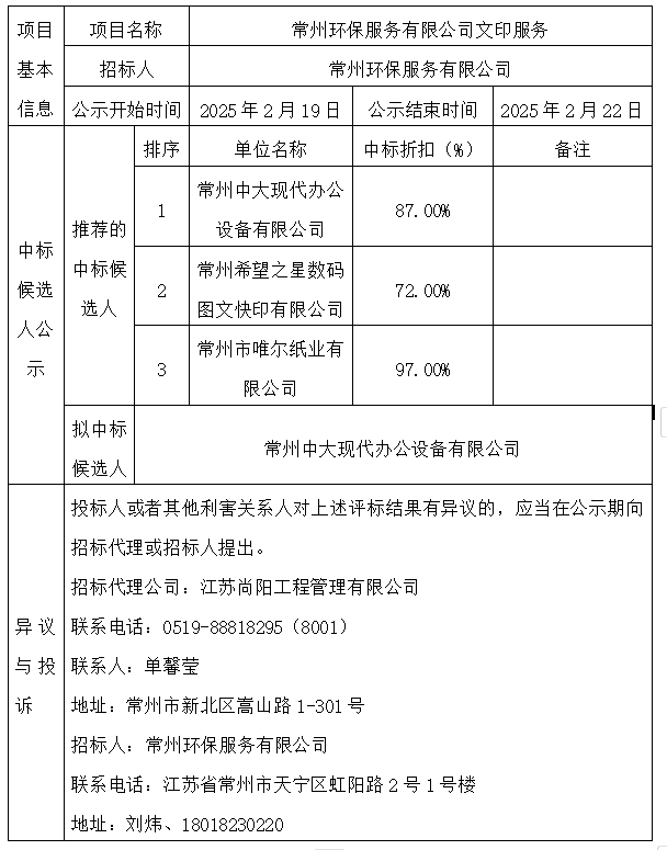 常州環(huán)保服務(wù)有限公司文印服務(wù)中標(biāo)候選人公示
