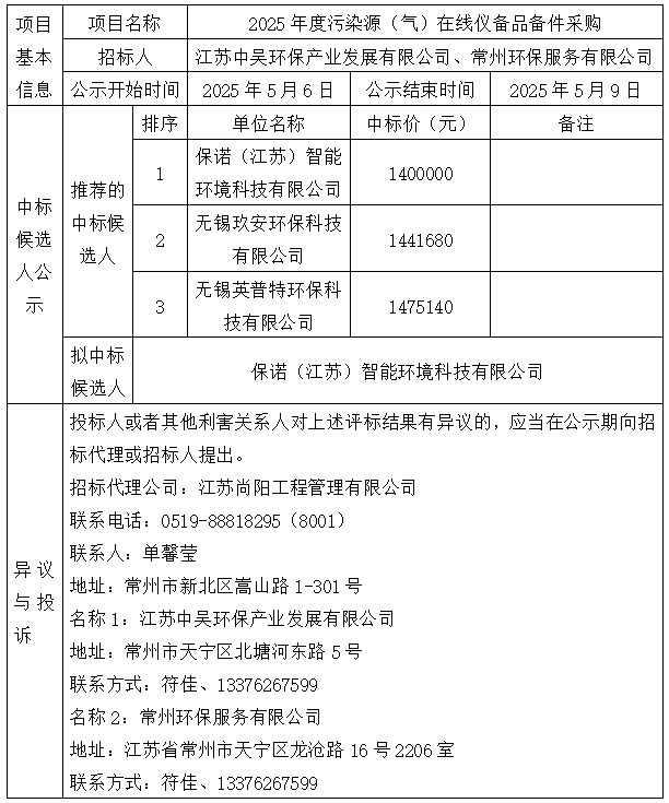 2025年度污染源(氣)在線儀備品備件采購(gòu)中標(biāo)候選人公示