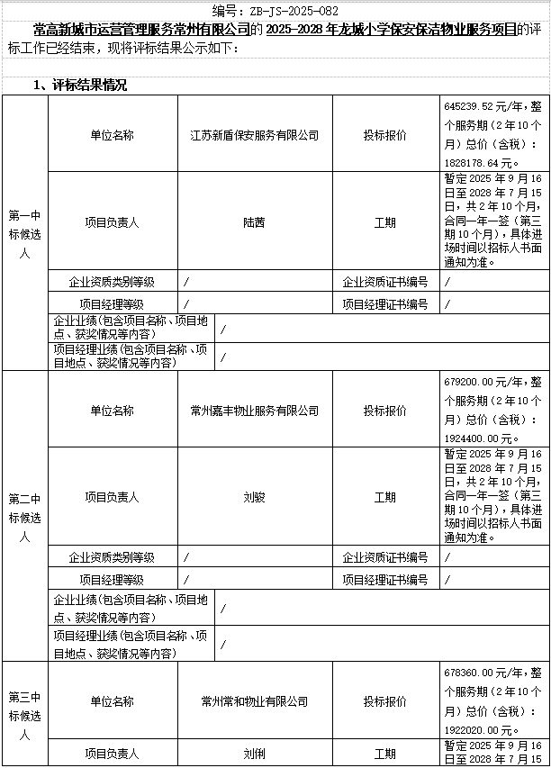 2025-2028年龍城小學(xué)保安保潔物業(yè)服務(wù)項(xiàng)目中標(biāo)結(jié)果公示