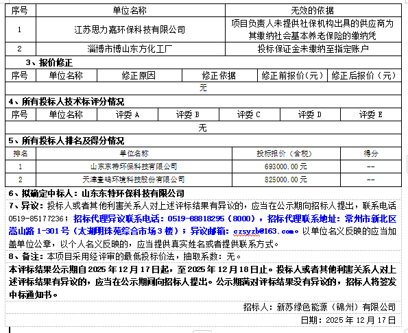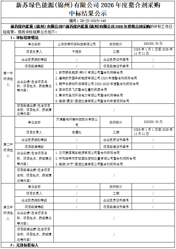 新蘇綠色能源(錦州)有限公司2026年度螯合劑采購(gòu) 中標(biāo)結(jié)果公示