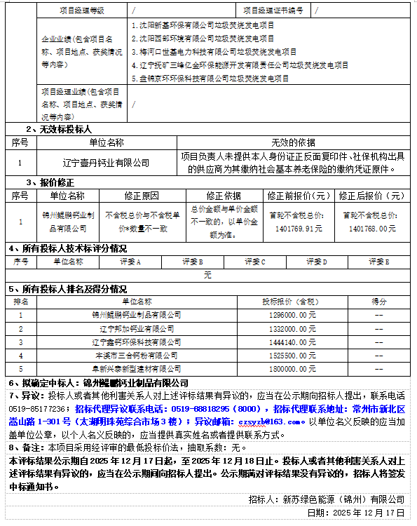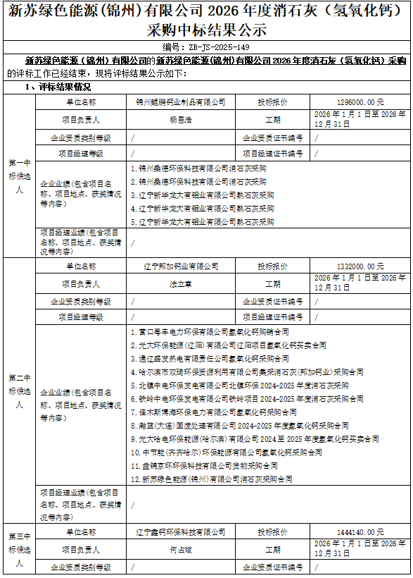 新蘇綠色能源(錦州)有限公司2026年度消石灰(氫氧化鈣)采購中標結(jié)果公示